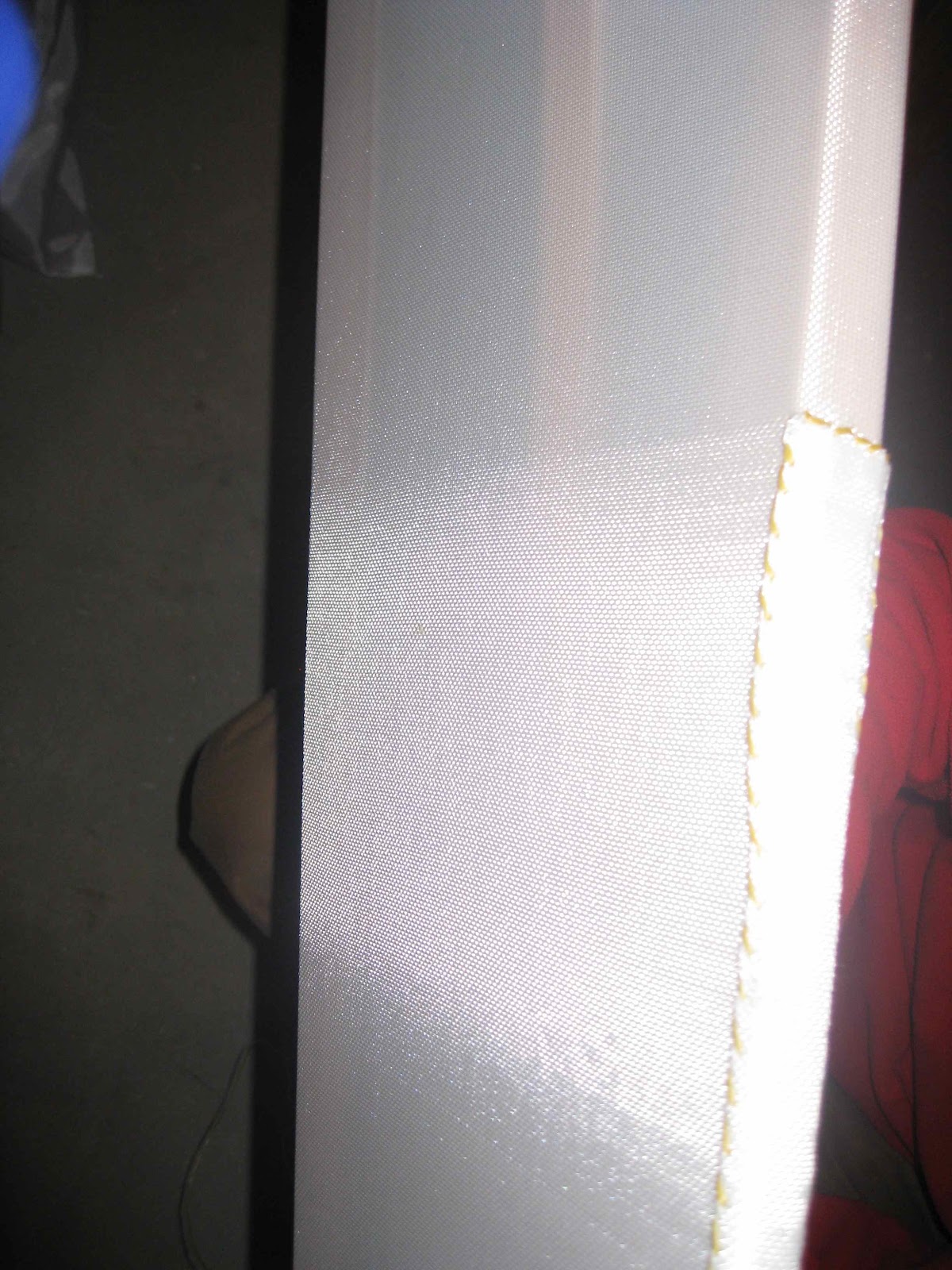 At this point, I was concerned that the amount that we would not get the fabric tight enough. I was also concerned about avoiding excessive pulls in the weave as it is a fairly loose weave. We'd seen some pulling around the thumb tacks if we tried to stretch the fabric too hard or un-evenly from side to side. To avoid pulling too many large holes, we opted for a method that many others have used. They sew a piece of nylon line into the edges so they can pull on the nylon line, not the fabric. This distributes the tension and gives a neat, finished appearance to the deck seam.